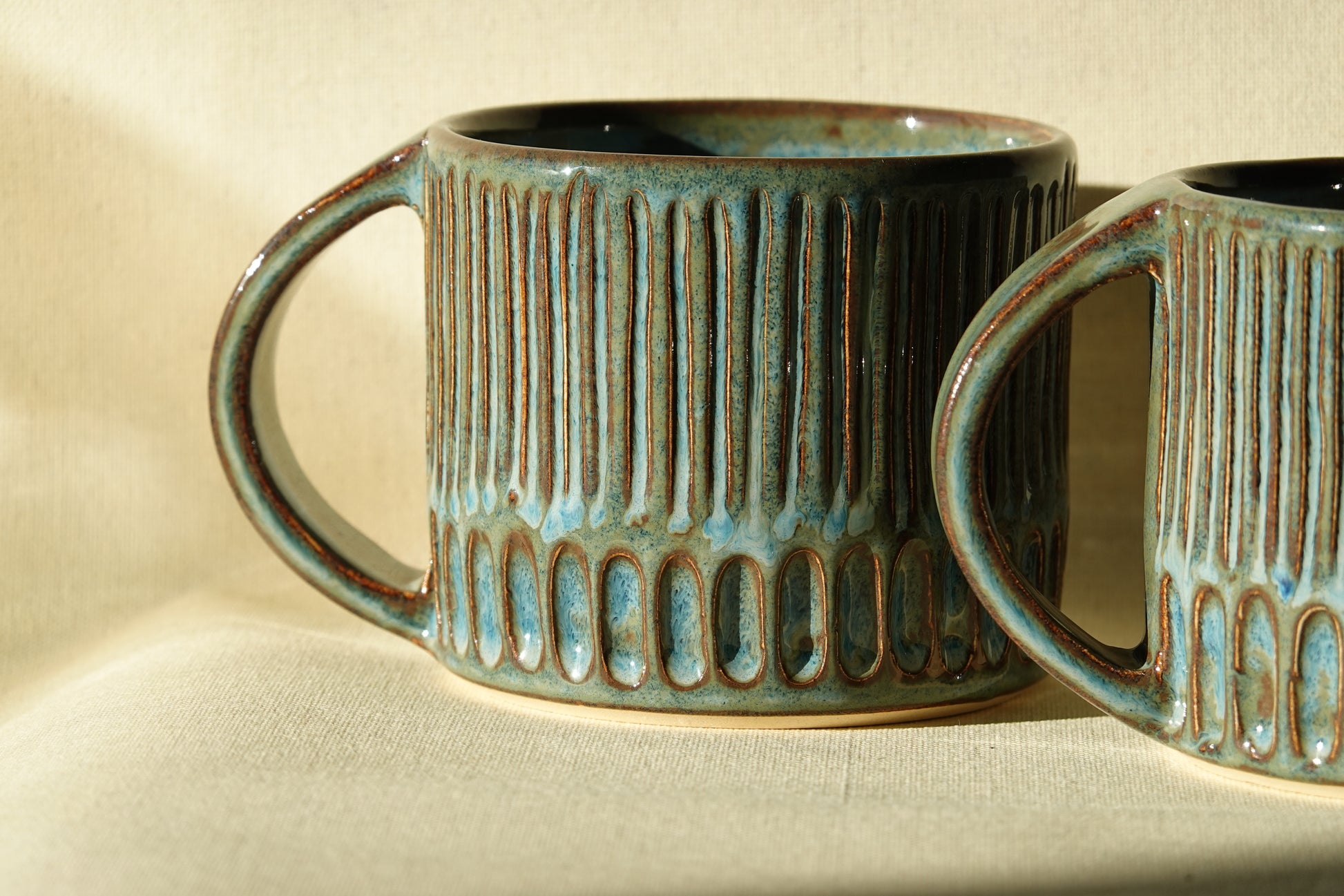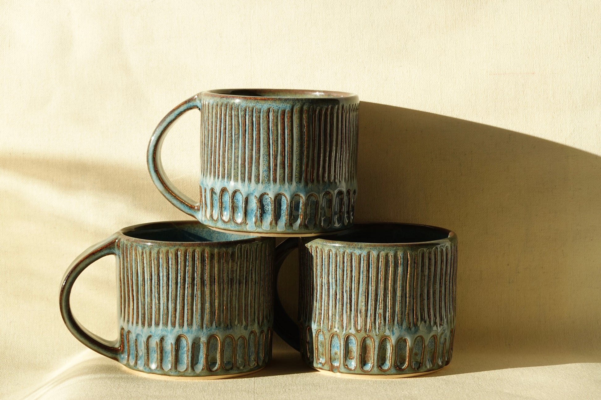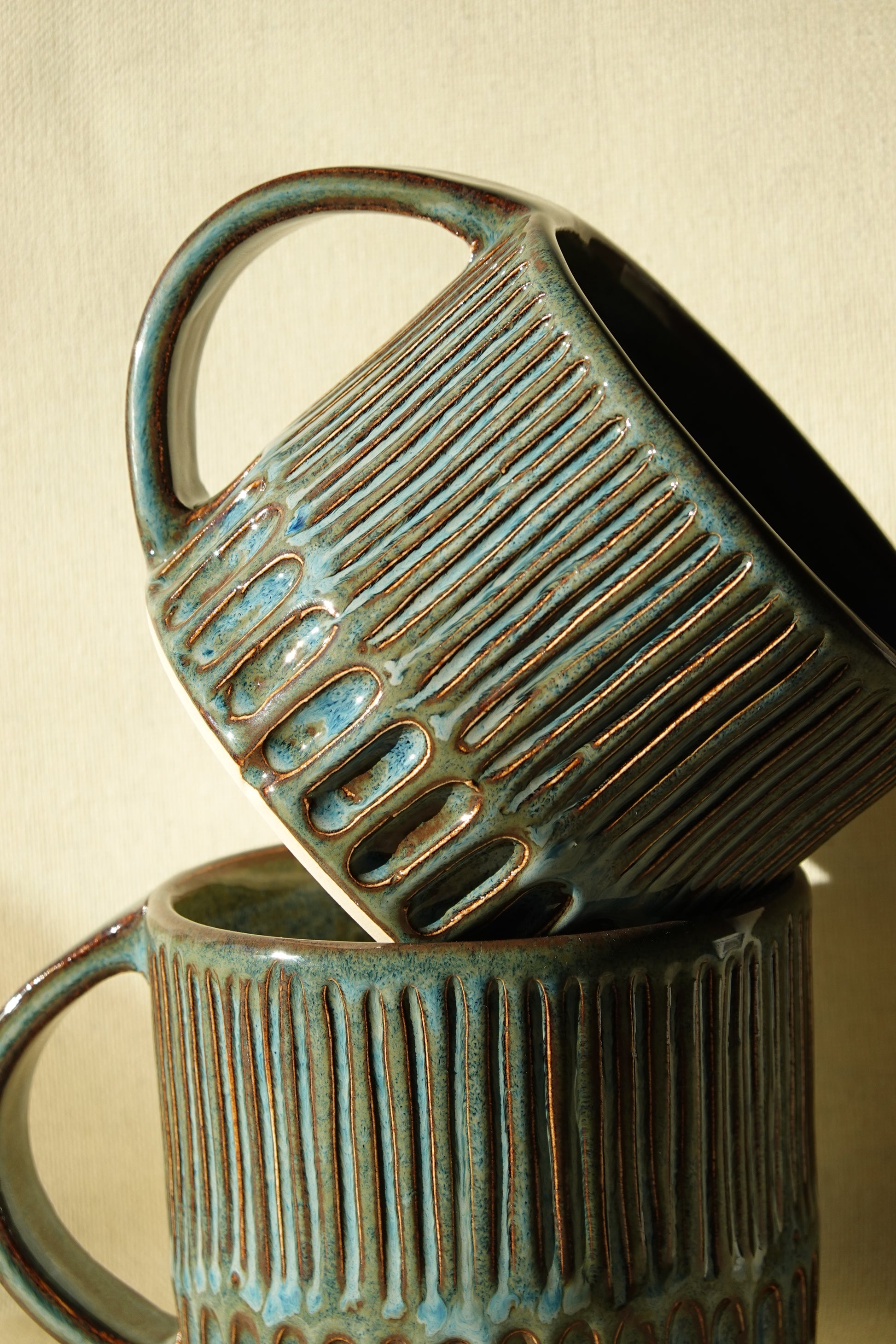 Large handled mugs, hand carved piece by piece and finished in a denim blue glaze.