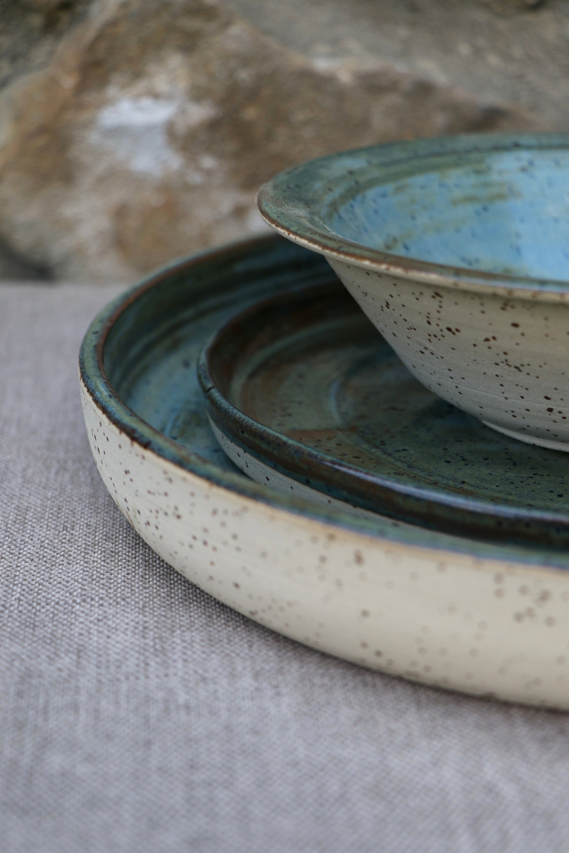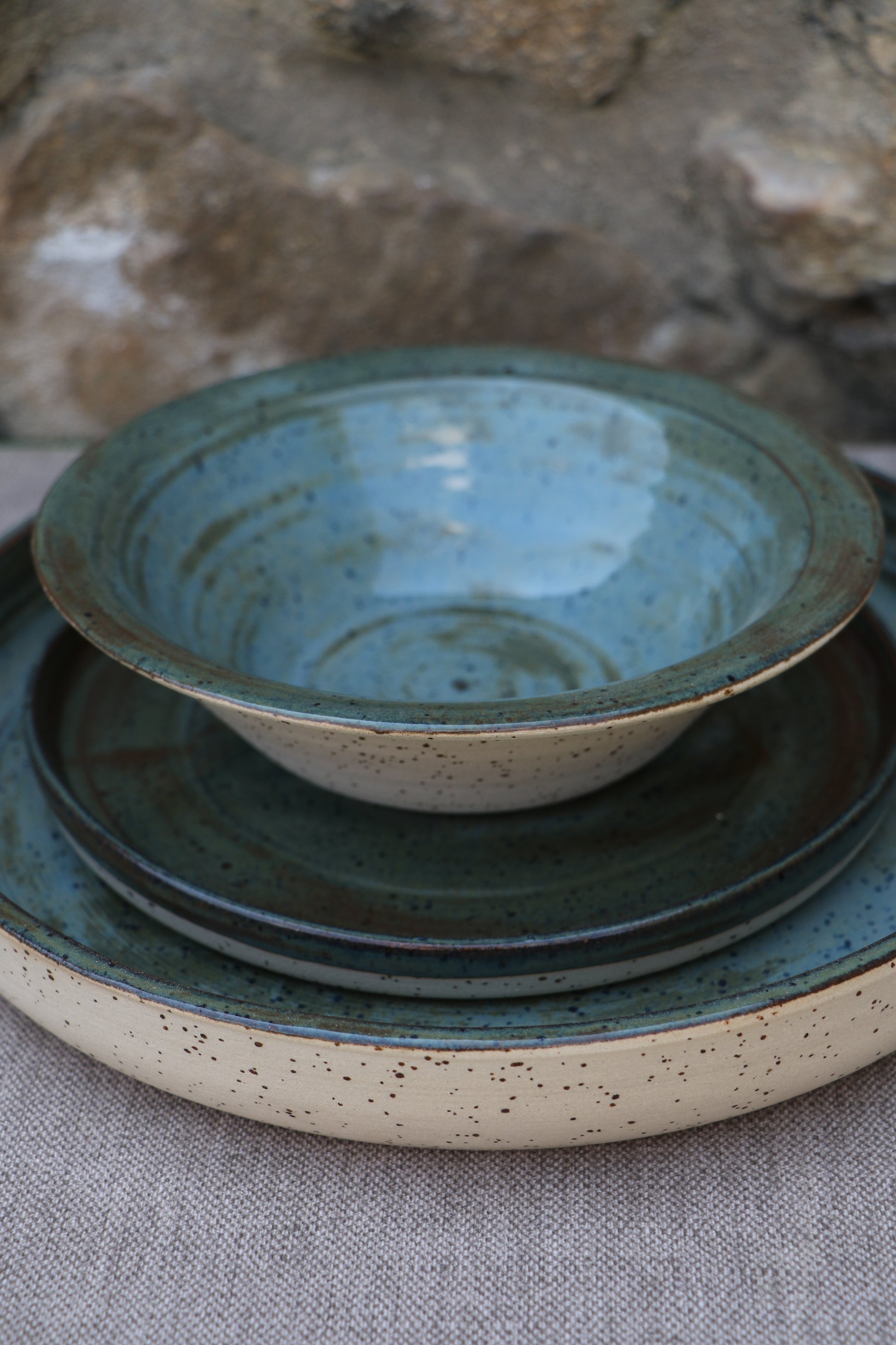 In a speckled clay body, the inside glazed with a transparent blue while the outer is unglazed.