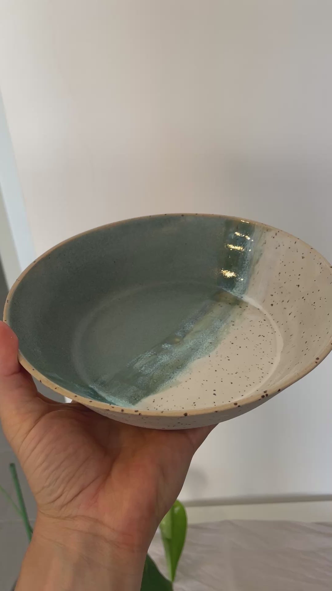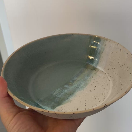 A small serving bowl on speckled clay. Glazed in a combination of white and turquoise, with the outside of the bowl unglazed.