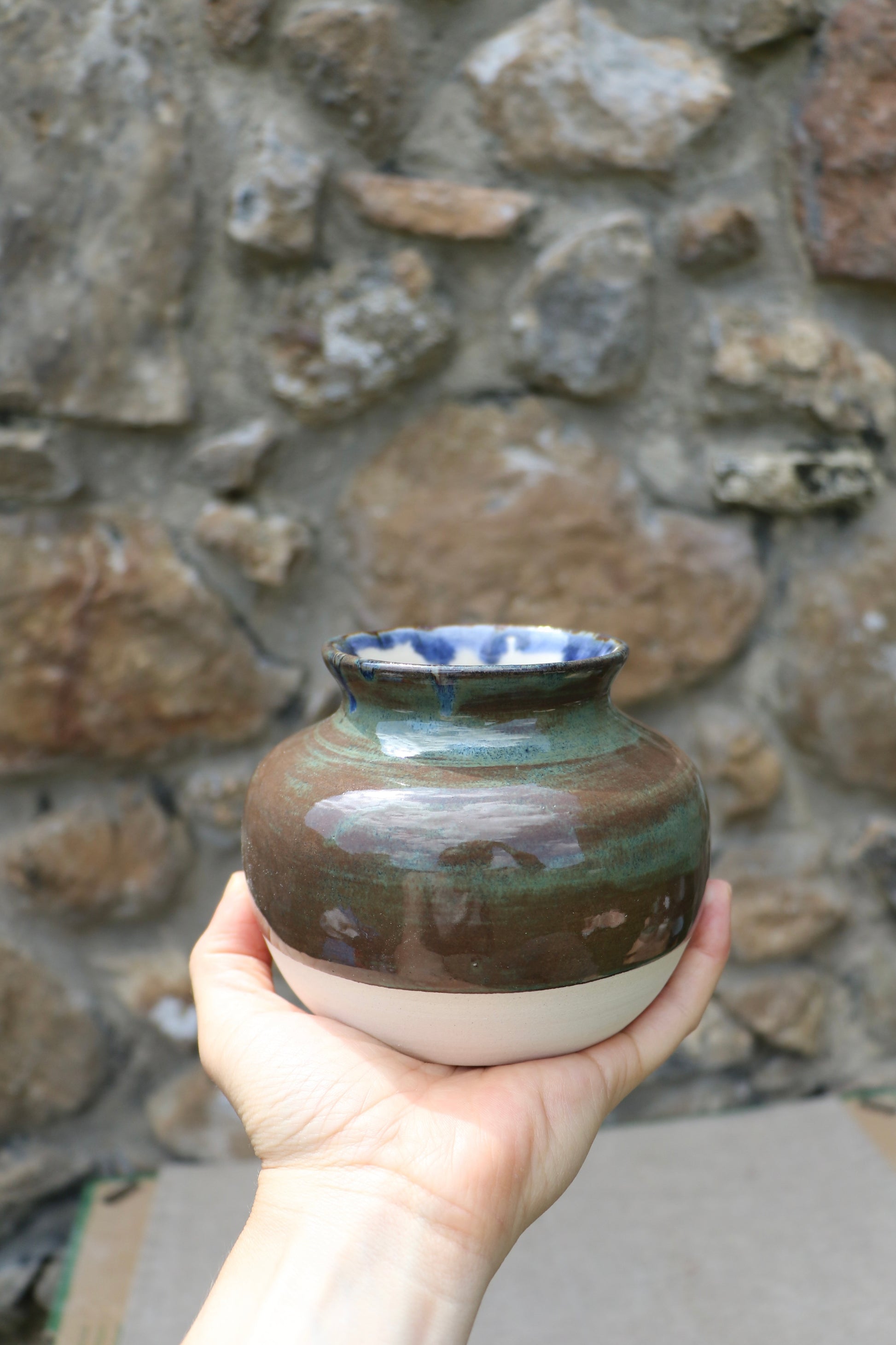 A small vase glazed in a brown and blue finish, with transparent glaze on the inside. Where the two glazes overlap there is a reaction that created a brighter blue effect.